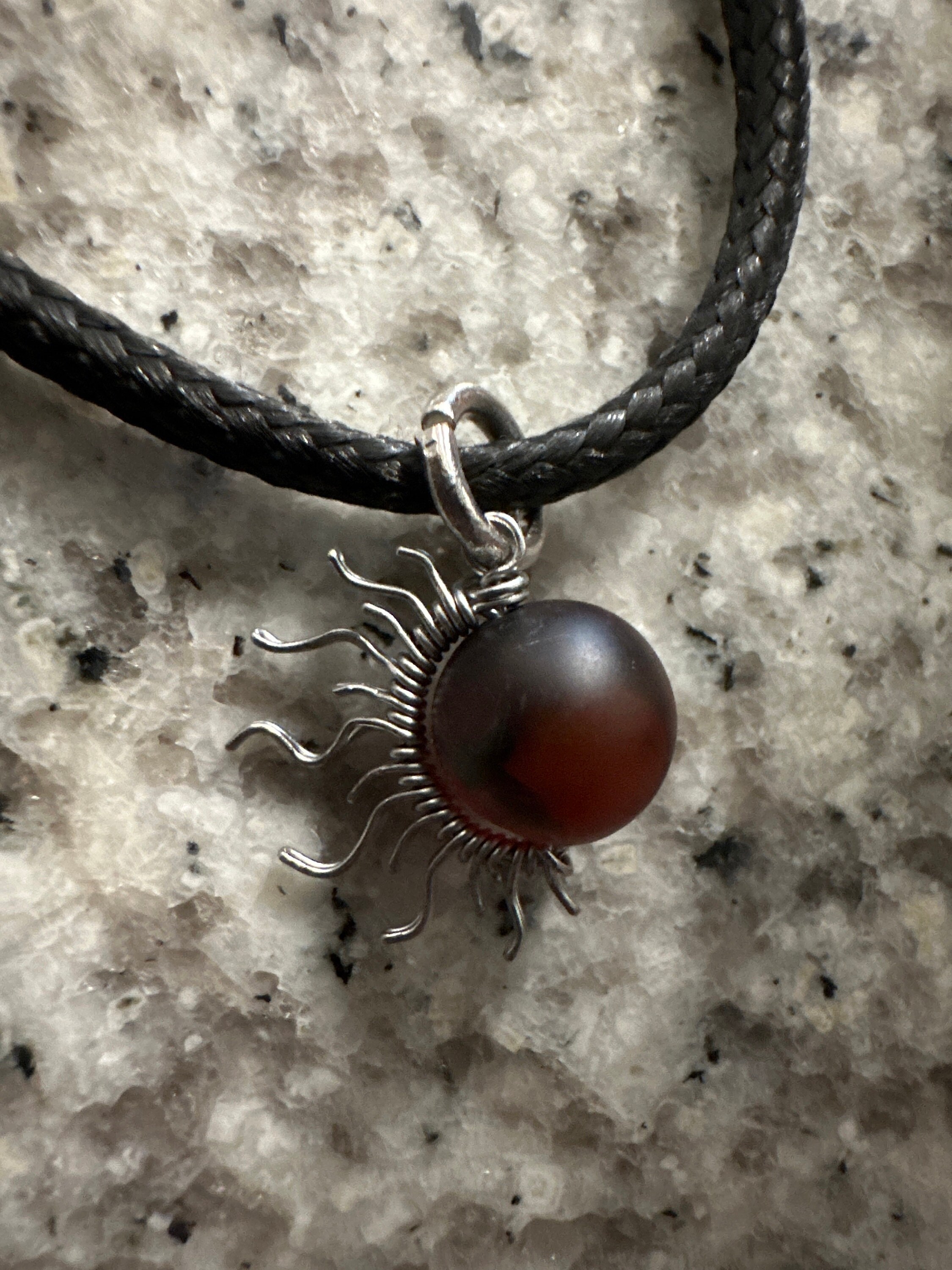 This sun pendant is created with a 10mm Bead wrapped in wire made into sunbursts that go halfway around the sphere which are looped at the top with a bail that attaches to the pendant with your choice of necklace.