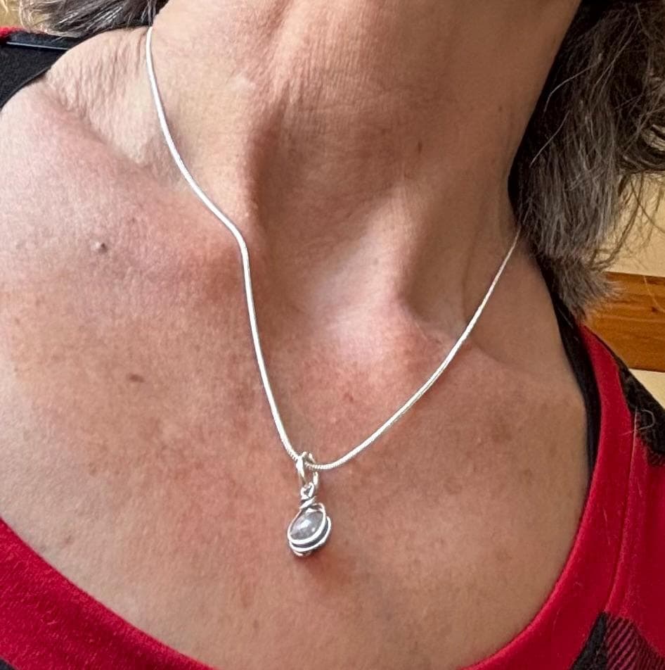 This is a beautiful Coprolite Fossil Dinosaur Poop pendant featuring a 6mm round bead which has a herringbone weave wrap tapering to a point over the top of the bead, setting it securely and attaching it to a jump ring, creating a very elegant look. This unique minimalist pendant would make a beautiful gift for Valentine's Day, a birthday, anniversary, Christmas, Mother's Day, or any special occasion. It could be worn as a casual necklace or complement any fancy evening attire. Measurements: Length: 0.75" Width: 0.25"